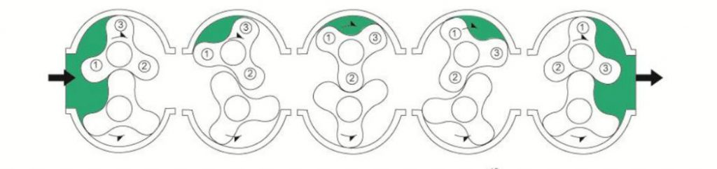 羅茨風(fēng)機為容積式風(fēng)機,輸送的風(fēng)量與轉(zhuǎn)數(shù)成比例,三葉型葉輪每轉(zhuǎn)動一次由2個葉輪進行3次吸、排氣, 與二葉型相比,氣體脈動變少,負(fù)荷變化小,機械強度高,噪音低,振動也小。